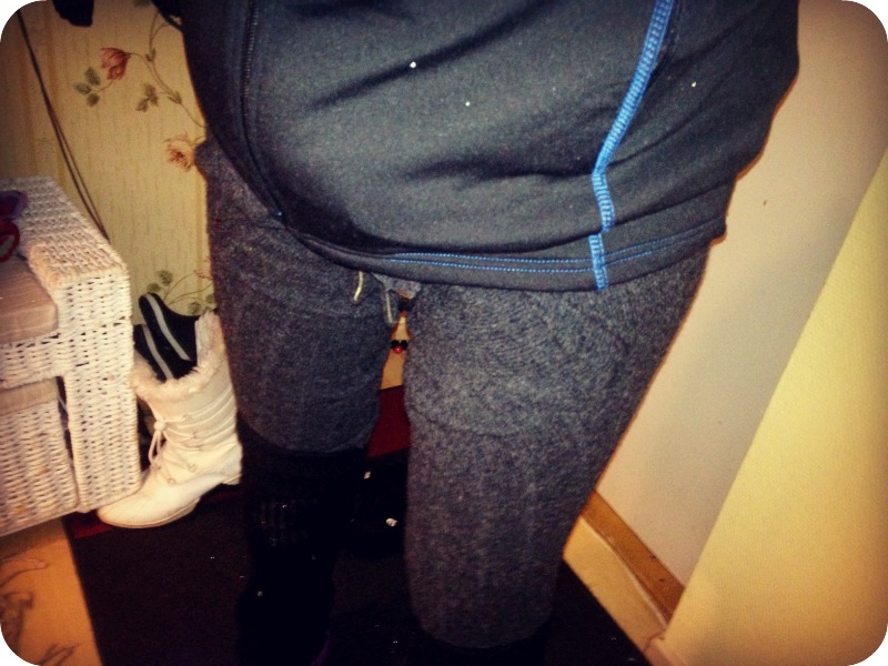 Vad gör man när man håller på att bli tokgalen på familjen och det är tolv minusgrader ute och man inte har några mamelucker? Jo, man klipper av ärmarna lite grann på en gammal ylletröja och sätter i fötterna, stoppar in den långa delen av tröjan i ryggen och knyter på framsidan. Glad och varm rumpa! Den enda nackdelen var att det såg ut som om man hade en magväska framtill, men sak samma. Jag springer ju för att bli snygg innanför kläderna, inte utanpå. Så fick jag också testa mina Icebugs. De ger ett fantastiskt grepp, men är ganska hårda framtill. En stycken blåsa förvärvade jag på mina 6,12 km. Jag vet inte hur nya lenkkidojor ska bete sig. Kanske man måste springa in dem lite?