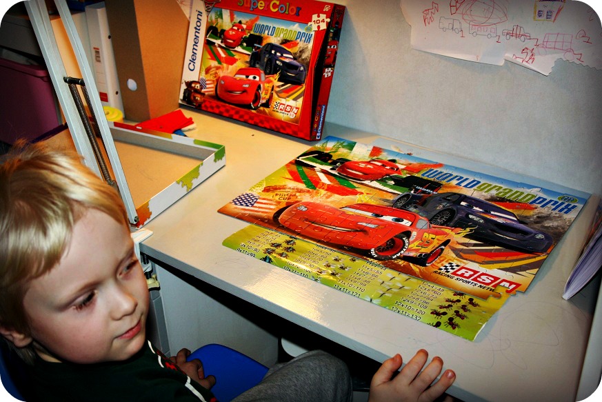 Stora W försöker bygga pussel ifred. Det gick rätt bra, så länge en förälder övervakar.