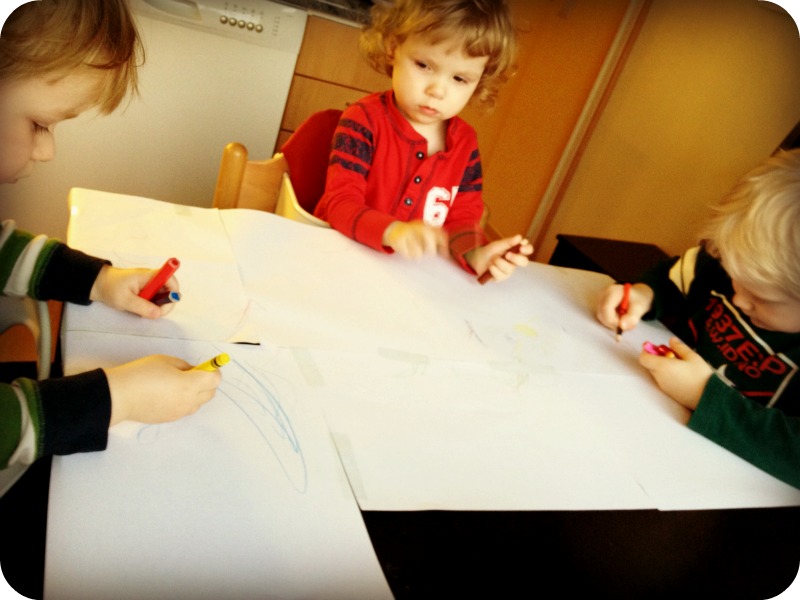 Jag skulle ha ”mysig ritstund i väntan på maten” med William och twinsen. Spände ut ett stort papper över köksbordet och lät ungarna rita. Men mysigt var inte ordet. Milja blev jättearg för att hon skulle ha JUST den pennan som Isaac hade. Isaac höll hårt i alla pennor han kom åt, utan att rita så mycket. Dessutom ville Milja, som vanligt, smaka på alla pennor, till och med bläckpennorna. Till slut kastade de pennor på varandra och då fick de inte vara med längre!