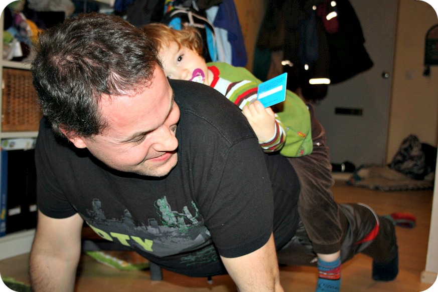 Och ligga som en säck på pappa, när han tränar armhävningar. Den lille, envise korven Isaac Ris. Han kommer säkert att tro att han heter Ris också, bara för att William hittat på det, men det passar liksom så bra. ”Hör du lilla Isaac Ris, kom nu”… osv. ^_^