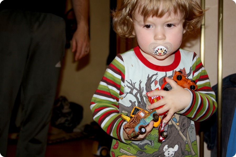 litenbillekIsaac leker gärna för sig själv just nu om han får. Han vårdar och bär och bär sina bilar eller nappar eller små pryttlar i famnen. Och va arg han blir när han inte får med alla saker! Idag gjorde han samma sak med docksakerna från dockskåpet hos fammo. Han plockade länge och stillsamt med dem.