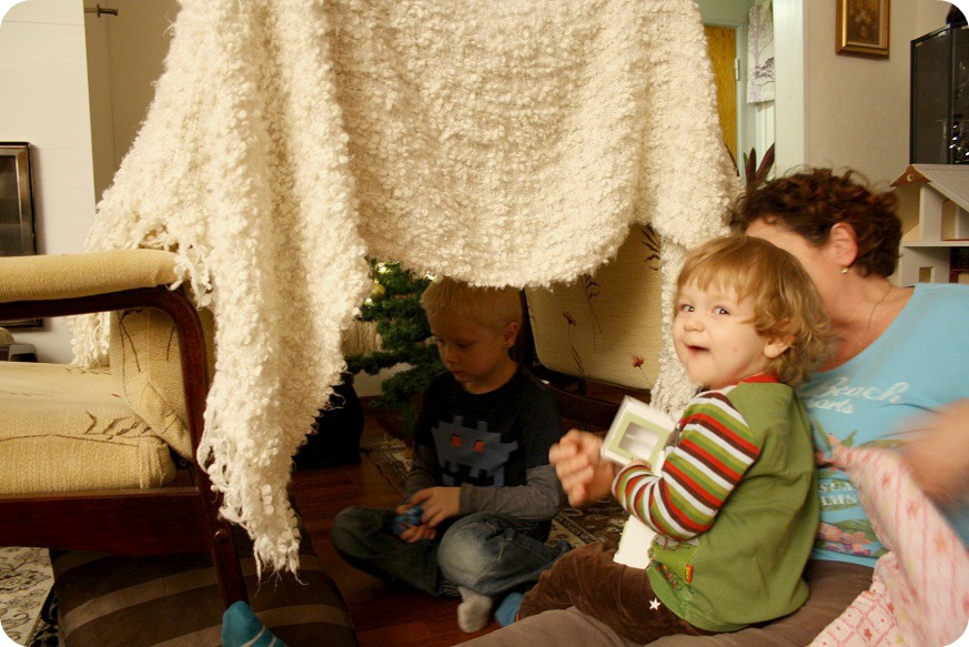 skojkojlek1Fast han ville vara med när det byggdes koja också! Det ville alla.