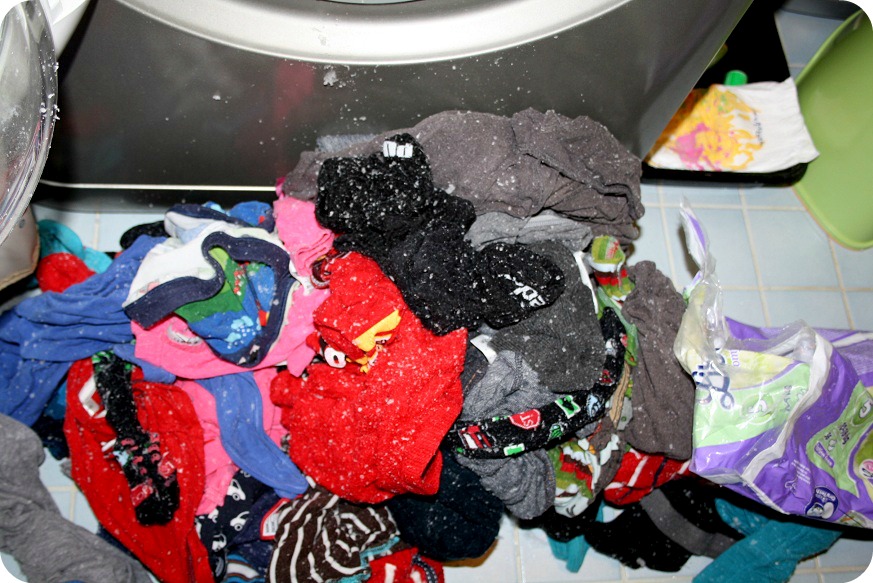 Vet ni förresten hur det ser ut när man tvättar en Liberoblöja? Såhär. Jag var helt säker på att jag tagit bort allt innan twinsen hjälpte mig med kläderna. Jag var … småarg, milt uttryckt, efter den här indicenten. Det var vit, geléaktig kramsnö som följde med ur maskinen. Och fan vad den satt fast! Rekommenderas ej. Självfallet hände det när jag hade satt maskinen full med alla små sockor och barnplagg också.