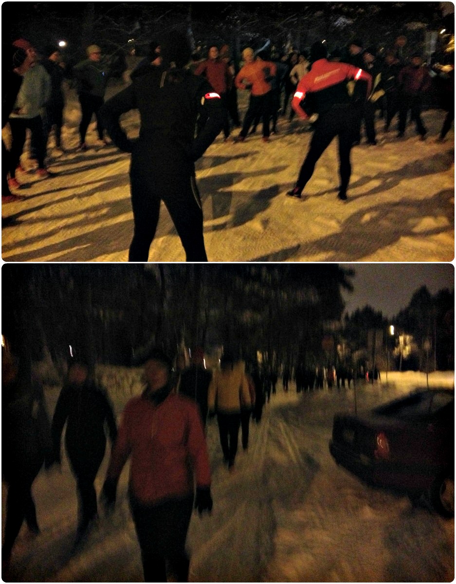Vi gjorde en hastig paus för stretching och jag tog ett par snabba och suddiga bilder av vårt långa lämmeltåg. Vi var 40-50 stycken idag. Ett tag sprang vi på en smal skogsstig, intill en djurkyrkogård. Det var alldeles tyst, ingen sa nåt eftersom vi inte sprang i bredd, man hörde bara de tyst tass-tass-stegen i en lätt upptrampad stig i snön som föll igår. Åh, nu längtar jag till våren då man kan springa i skogen, utan att behöva frysa eller tänka på megamycket kläder!