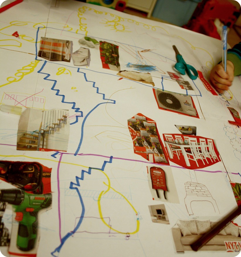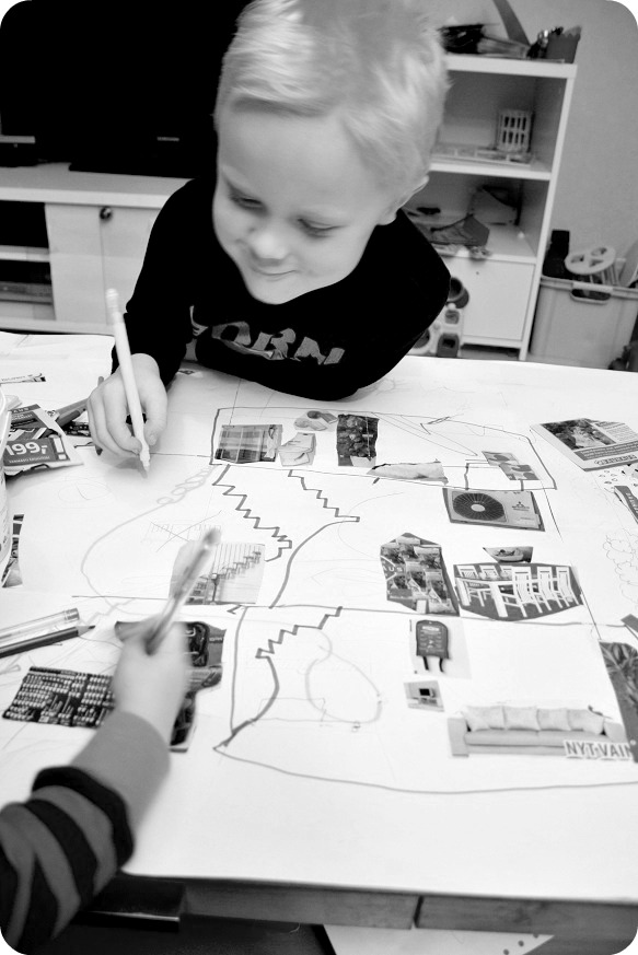 Vi fortsätter vårt pysslande. Plötsligt duger Williams ritade bilar igen. Han behövde kanske bara förstå det. Vi klipper bilder ur reklamblad och ritar hus, inredning, värmepump och ”strömsparare”. Wili ritar vindkraftverk, som han såg från Viking-båten och Isaac klottrar överallt och jag säger att han är konstnär som bidrar med eget klotterkonst.