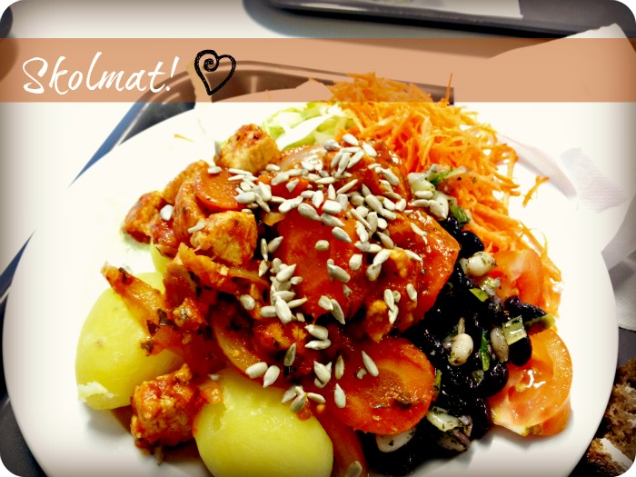 Jag har sagt det förut och jag säger det igen: Varför klandras det så mycket på skolmaten? Okej, vissa dagar är det kanske inte lika bra som andra, men sådär överlag tycker jag vi har jättebra mat i vår skola. Då ska man också tänka på att vi är över 500 elever under samma tak. För 4,25 åt jag: potatis (eller ris) och dagens veggomåltid; Quorn med grönsaker och lök i tomatsås. Det var gott och mättande! Vår studiegrupp är ju ändå ganska lite i skolan, därför är jag så oerhört glad åt att sätta mig vid ett bord med färdiglagad mat! Jag sa detta till en av de andra tvillingmammorna i gruppen (japp, vi är tre) och hon förstod mig. Hon har tre pojkar i åldern 12, 12 och 14 och säger sig agera storkök väldigt, väldigt ofta. Såna där gånger är jag glad att det i alla fall är en tjej i familjen (av barnen).