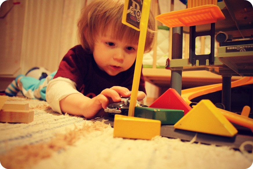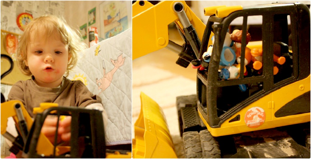 Milja och Isaac lekte sina egna lekar. Gamla loppisfynd som garage är fortfarande superpopulära. Förutom att Isaac petade in Finn McMissile i en trång glasbur (en affärsbyggnad, jag lekte att det var ett magiskt isslott och Finn var frusen bakom en magisk vägg, men William ville leka mammapappabarn) och jag hade fullt sjå att få ut eländet alla tre gånger, så gick det bra! Milja tyckte att grävmaskinen skulle ha MÅNGA förare.