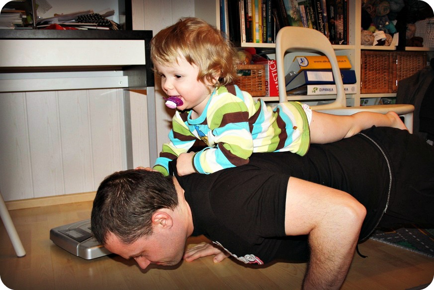 William hjälpte pappa med armhävningarna och sen Milja. I rättvisans namn, som det är med tvillingar, ville Milja sedan att det skulle vara ”Isaaas tuij!” och så blev träningen lite längre och tyngre – och roligare!