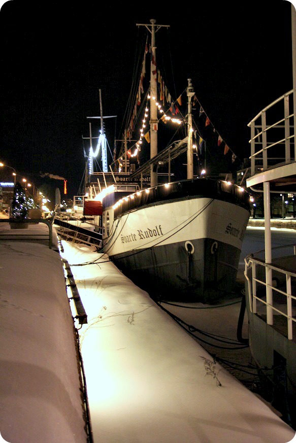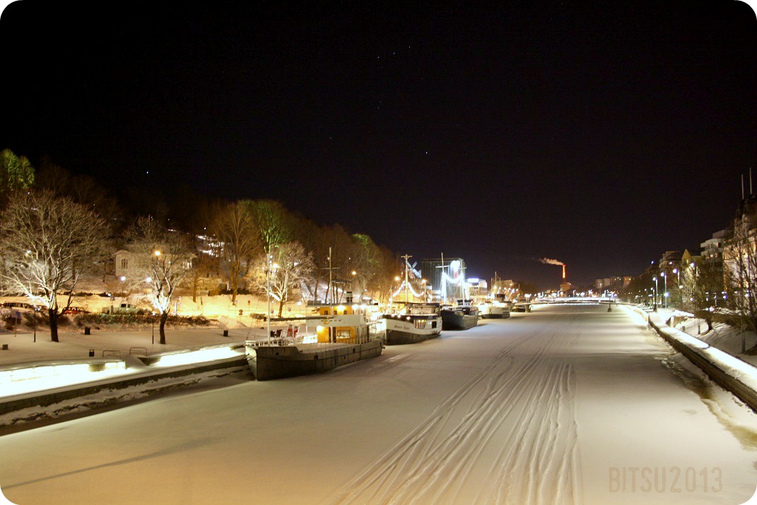 le_abo_orange1Jag har världens vårkänslor, även om det är -15 grader ute och vi har hur mycket snö som helst! Visst är det märkligt vad det här dagsljuset kan göra. Bara vetskapen om att man är på väg mot våren, är glädjande nog. Det är fortfarande fint med snö och kalla nätter och om man kollar riktigt noga på den övre bilden, kan man till och med se Orions bälte ovanför infrusna restaurangbåtar.