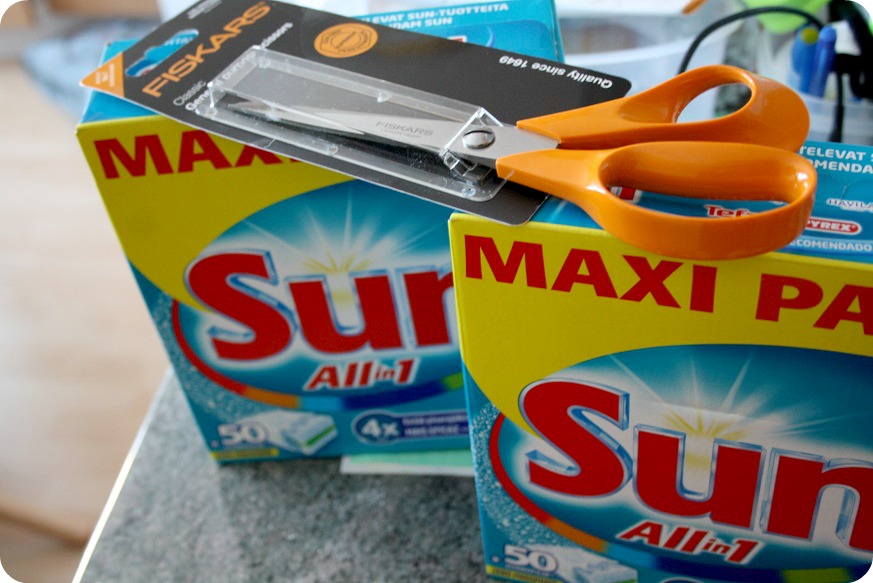 Att få en sax (!) på köpet, när man handlar maskindiskmedel, det är inte fy skam! Saxen var ju dyrare än tabletterna. Tack tack Citymarket, säger vi bara. Förresten måste det tilläggas att Kuppis’ Citymarket är alldeles förträffligt när det gäller att hitta ekologiska och närproducerade produkter, det gillar vi skarpt! De är en föregångare för de andra stora Citymarketarna.