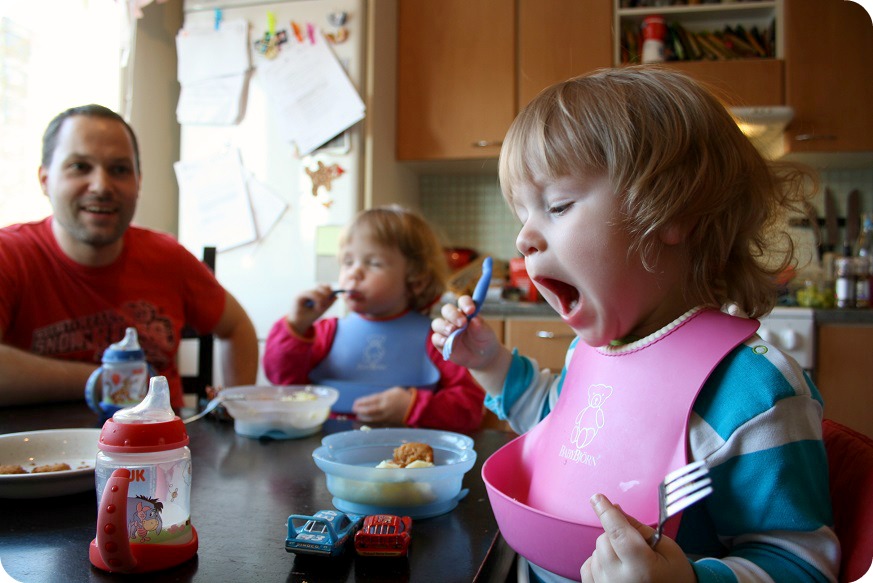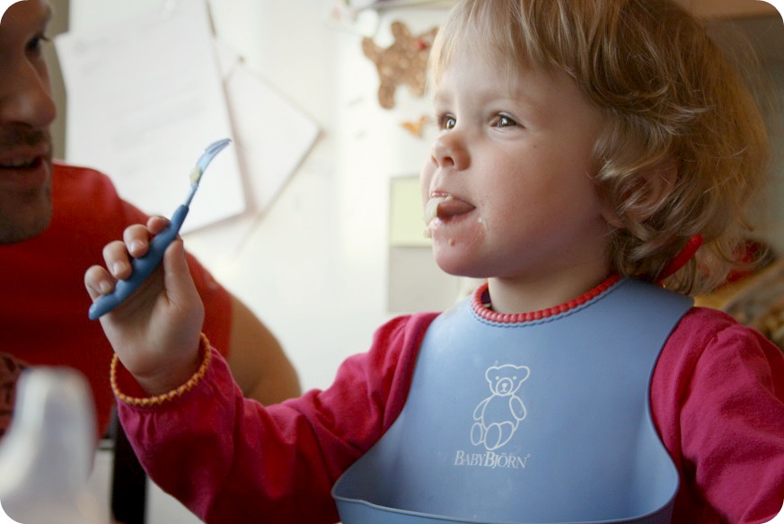 – Namm namm, äta man! (så länge hon inte spottar. Och jag fattar inte varför det är så roligt att sätta maten på bordet och först sen i munnen. Men nåja, åtminstone äter de själva!)
