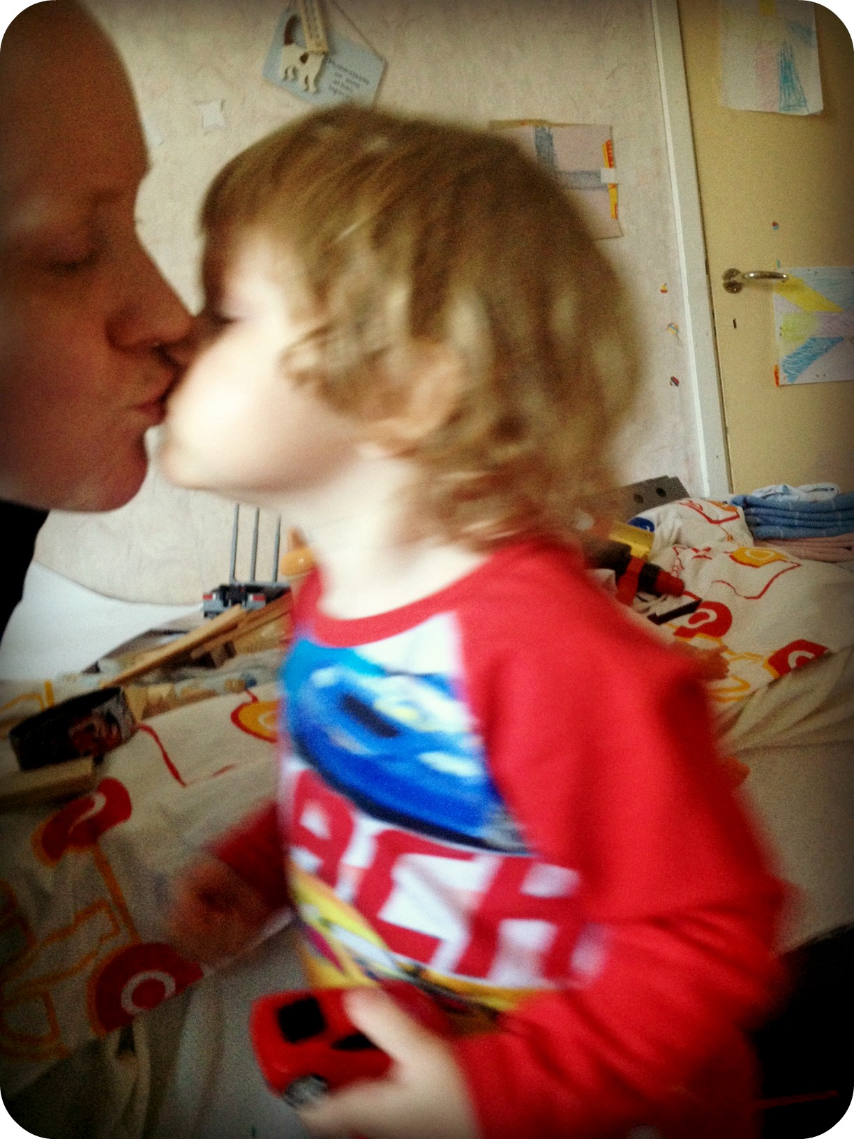 Har man tur, kan man stjäla en puss från en liten eller stor son mitt i leken. Isaac och Milja blir alltid upprörda om vi tillrättavisar William eller annars bara höjer rösten. ”Ingen fara mamma, Isaac pussa”, säger minsta sonen och Milja hakar på. Idag skar jag mig på en konservburk (Mika fick plåstra om mig, för det blödde rätt kraftigt) och Milja var uppenbart berörd av att ”mamma ha plåster”, att det liksom är ett ont där inunder. Jag tröstade henne med att det snart blir bra och det verkade duga. ^_^
