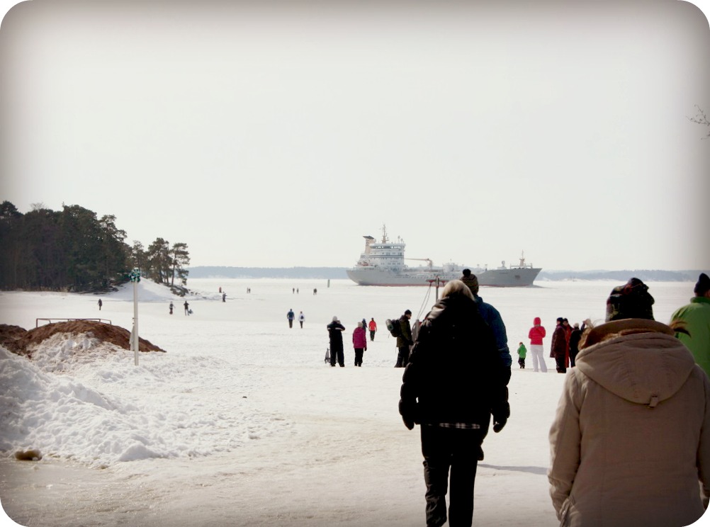 Det såg sjukt ut när de stora båtarna kom förbi i farleden en bit bort och folk fortsätter att gå på isen nära stranden. Det är faktiskt så genomfrustet att det gick bra.