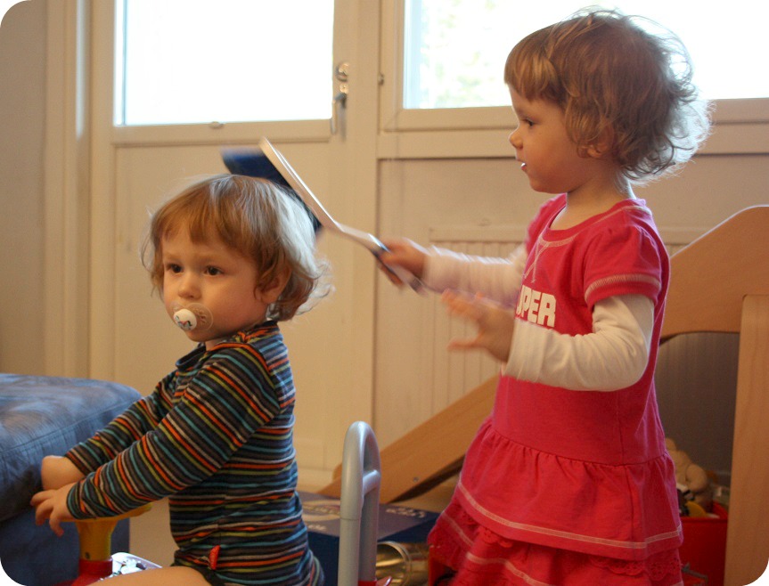 Milja försöker frisera Isaacs hår. Ett tag gick han undan, men sen var det tydligen mysigt. Fast nästa gång får det blev med nåt annat än köksborsten.