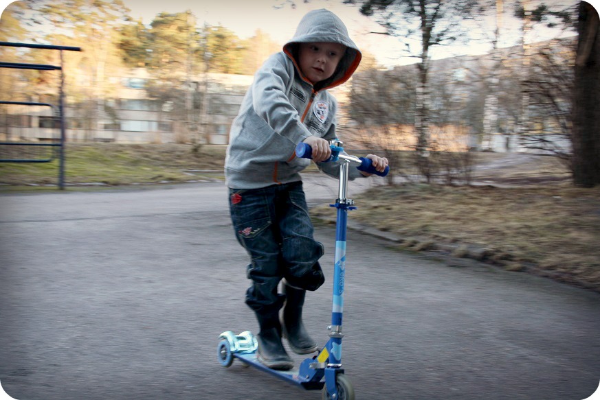 Vad han växer! Man märker det liksom extra mycket när man får höja handtaget, som var för allför högt ifjol, då i samma höjd som på bilden ovan. Och jo, han borde ha hjälmen på sig.
