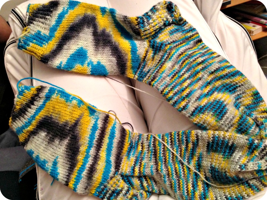 En avslutning på mina Fliegende Untertasse-sockor i Schoppel Wolles garn. Jag hann se lite av Postkodmiljonären idag också och började nästan lipa när den där unga tjejen i kiosken vann en miljon kronor. Äntligen en ung person!