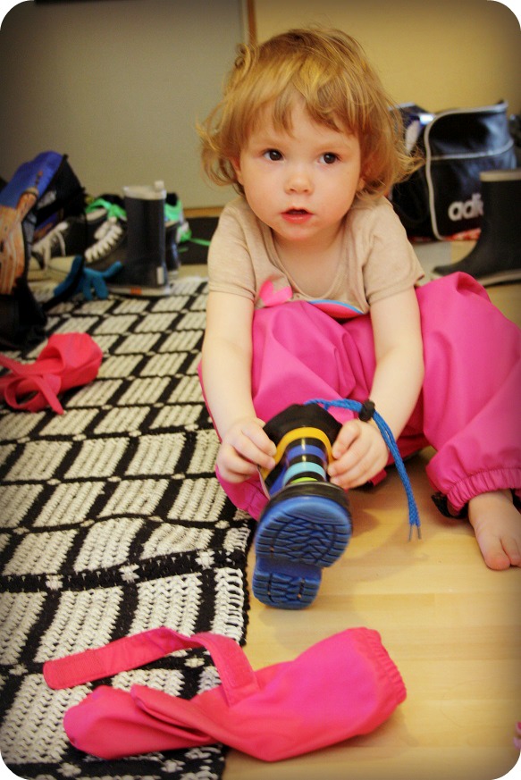 Milja fortsätter att klä på sig regnkläder. Jag vet inte varför, men hon tycker tydligen det är väldigt roligt. Båda tvillingarna har börjat prata jättemycket nu också. Isaac växlar till finska när han pratar med Mika, så han tycks redan kunna skilja på språken. Milja pratar (enligt mig) lite mer otydligt, men det beror på vad man pratar om. Isaac tar efter William i nästan allt. Speciellt i att ”allt är bajs” eller ”det här är tråkigt”, fast han inte tycker så. Men man måste ju säga det, när storebror gör det.