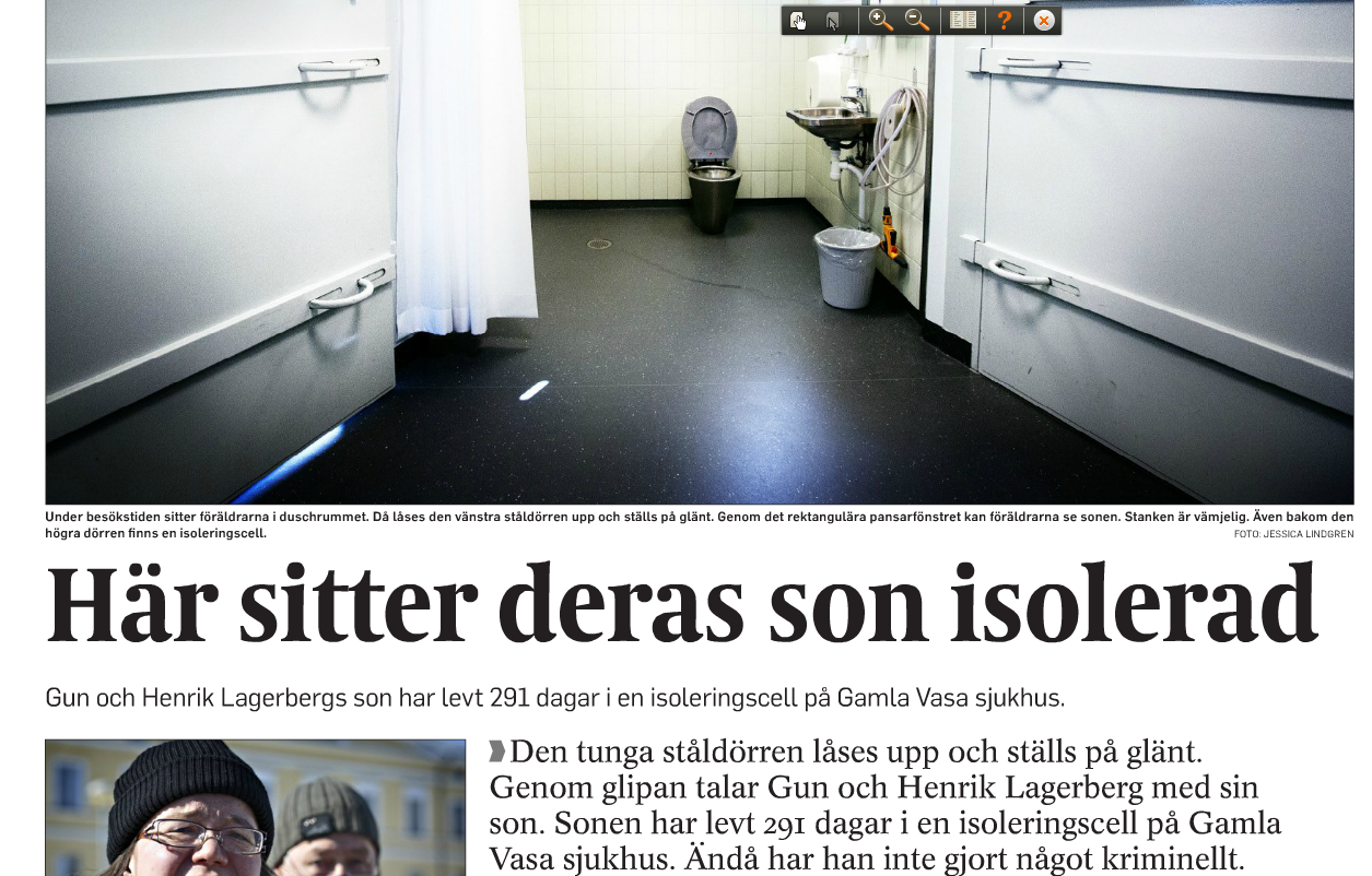 Jag skulle ha förstått det, lite grann, om det var tidigt 70- eller 80-tal. Jag var faktiskt på väg till samma plats, för att jag hade så ”groteska tics” och för att jag slog mig själv på ögat och viftade med armarna och hade så svårt att över huvud taget vara med andra människor. Min mamma var säkert helt slutkörd och hon bad faktiskt om att få mig flyttad till samma plats där den här killen sitter nu, ovetande om vad det egentligen innebar. Jag missade min utgång från sjätte klassen, jag började i sjuan – mot alla odds – tillsammans med alla klasskamrater, för att jag fick hjälp och stöd. Jag träffade en läkare som fattade att det här skulle gå bra, att det skulle lugna ner sig. Ja, som sagt, allt det där är överspelat för min egen del, men jag vet att det har funnits andra som kommit efter mig, långt senare, med bland annat Tourettes syndrom, som har varit i karantän eller fast på Vasa sjukhus -i isoleringen. Hur kan det hända? Det har också handlat om underåriga som inte ens tillåtits ha telefonkontakt när de vill med sina föräldrar och det här är bara så sjukt.