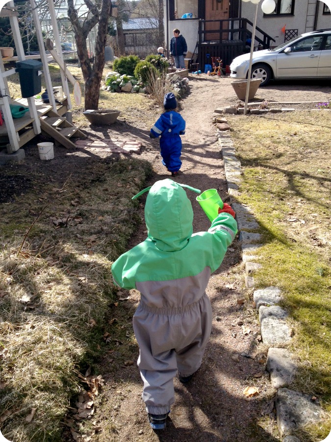 Vi har bilar i sängen, dockor, små leksakspajer. Det är alldeles för mycket damm och ludd på vardagsrumsmattan, men som tur är, kan man inte dammsuga efter klockan nio. Det är HELG efter imorron och det betyder pigga barn (som annars ligger och drar sig och INTE vill stiga upp, förutom Isaac) när vi ska till dagis. Det är kläder och små högar överallt och killarna måste få nya lenkkiskor. Det är sand, sand, sand i tamburen och kettlebellsdunkande på balkongen. Men Mika bytte i alla fall till sommardäck på bilen, skönt!