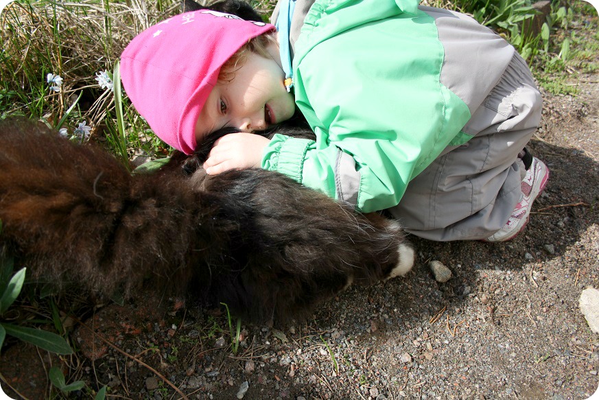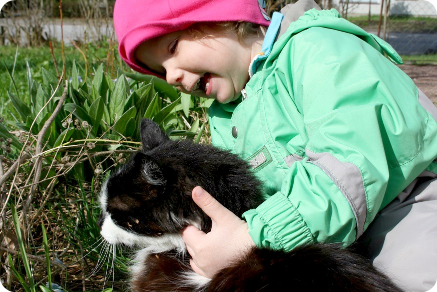Milja var så lycklig när grannens katt kom över till fammo&faffa. Hon kvittrar, pratar, klappar och lägger sig på katten, som tack och lov är en mycket snäll variant. Isaac&William är också intresserade av katten, men inte på samma sätt som Milja. Förresten påminner den där lurvbollen, Misty mig om första katt. Den döpte jag till Cleopatra, för hon var så lurvig och ståtlig. Begravningen var också en av de finaste våra katter fick. Ett träkors med namn och vers, runda stenar i rad, blommor på en uppgrävd yta nere vid Esse å. Nu är hon en kattstjärna på himlen, som jag brukar säga åt William.