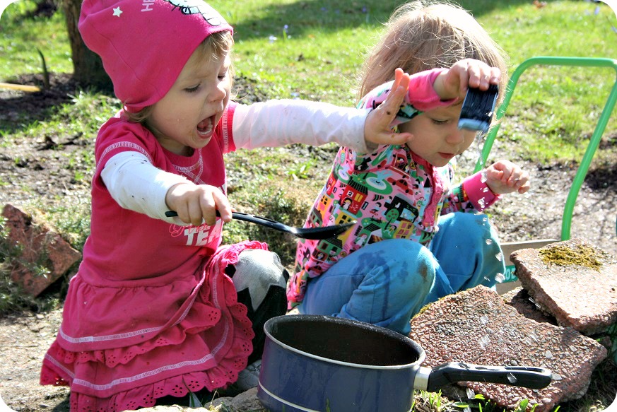 Vår morgon startade hemma med vattenlek, bad av nappar och Angry Birds-figurer i handfatet på lilltoan – och fortsatte med mera vattenlekar utomhus, hos fammo. Och alla var faktiskt ganska torra, med tanke på hur mycket vatten de små hällde ut och hur mycket soppor och lerkakor det kokades.