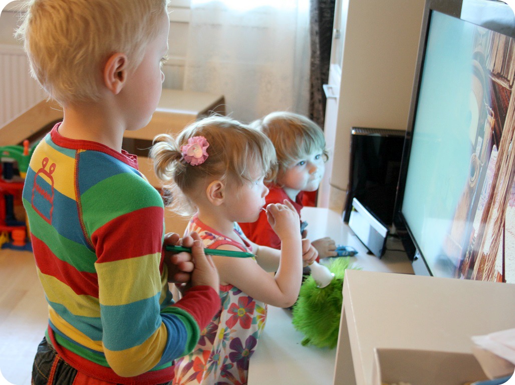 Efter en lång dag både inne och ute, radade de upp sig framför TVn och stod faktiskt stilla (och tysta!) en stund utan att bråka.