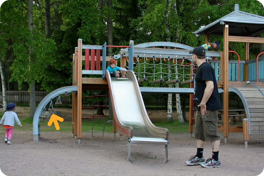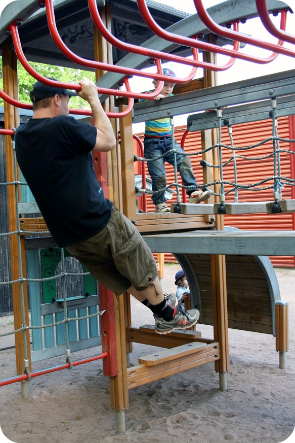 Är det nån annan som tycker att det här parkhänget är rena rama träningspasset ibland? Okej, det beror kanske på att vi har tre vilda ungar, som alltid ska klättra där det är högst och brantast, självklart. Det är ju mest spännande där. Eller så ska twinsen absolut ta sig upp där William just lärt sig komma upp själv, som vid branta träpanelen eller de dinglande trapporna.