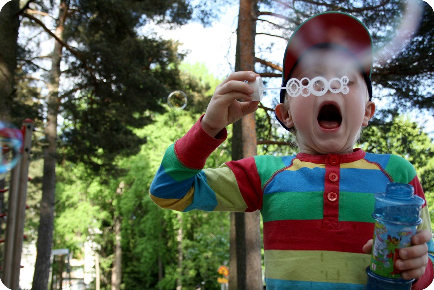 Den här bubbelleken blev så rolig, att vi fick avbryta den. Vi turades om att blåsa, William sprang omkring som en tok och ”dödade” alla bubblor eller dumsnutar och Isaac hakade genast på: Dommsnuutrar, dommsnuutrar.