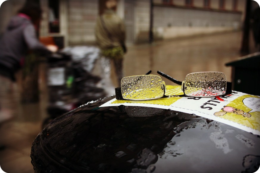 Ut i regnet igen med barnvagnar, folk och bilar och avspärrningar. Någon hade tappat sina glasögonen i röran.