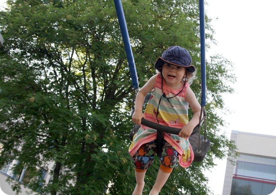 Milja, fartdåren, ska ha ”stora farten” varje gång. Och helst ska man ta tag i gungen i farten och stanna upp, hålla och sen släppa. Kanske jag har en åkarkompis till alla vilda karuseller på nöjesfälten i framtiden? Om man själv vågar, då åldern smyger sig på (fast jag vet att min egen pappa alltid vågat åka med oss kids, det är bra!)