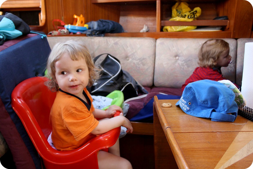 sasattvi”Gunga!” sa Milja när hon först kom in i båten. Faffa fixade en sittplats åt dem redan ifjol genom att skruvat fast gungorna under sittdynorna. Även om twinsen klarar att sitta vanligt, blir det lättare ibland när de sitter lite mer stilla.
