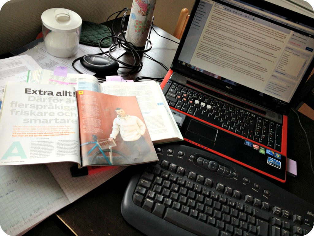 I samma tidning pratades det om att barn (eller vuxna) som lär sig två språk, får lättare att lära flera språk också och är, hör och häpna, smartare och friskare (!). Barn lär sig glida mellan språken och märker inte alltid att de byter språk; kodväxling, som det heter så fint. Jag tycker det är så coolt. Milja t.ex., blandar ihop finska och svenska. När hon ska ha en kudde ber hon om en ”koono” (uttalas som ko, fast med långt o), alltså en blandning mellan finskan tyyny och svenskas kudde.