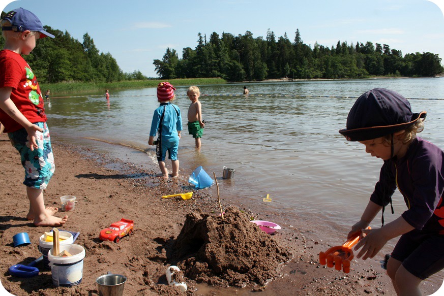 sandstraand45Vi drog till Runsala sandstrand i bästa sommargasset. Milja var bekymrad över att hennes baddräkt blev blöt och att hon måste fortsätta ha den då. 🙂 Vi är ju inte så vana strandbadare, men alla blev modigare mot slutet. Jag premiärsimmade (check!) i ett lite svalt, saltigt vatten. Nu efteråt kollade jag på webben – det var 16,2 grader. 18 brukar vara helt okej att simma en stund i.