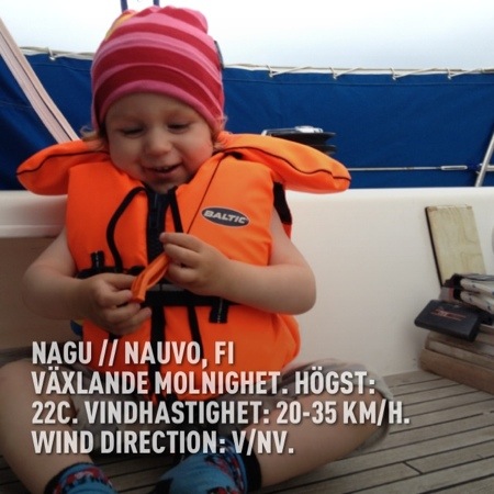 Vi befinner oss till sjöss, hela familjen och fammo&faffa. Vi går in på natt två och än så länge är alla barn glada, trötta på kvällen och ganska busiga. Men det går! Imorron seglar vi vidare, lite längre utåt, eftersom det har utlovats sydliga vindar (bra med tanke på vår kurs) och inte för hård vind, som idag; 10 sekundmeter. Det skulle gå rätt bra att segla i om man kunde ligga med schyst slagsida och reva lite grann, men inte med tre små barn.