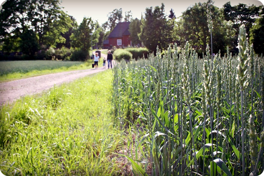 På väg till stranden gick vi förbi vajade vetefält (eller är det råg, mitt minne sviker mig!?) och den där kyrkan som doftade så krafigt av tjära. (ps, det är vete, fick jag bekräftat!)
