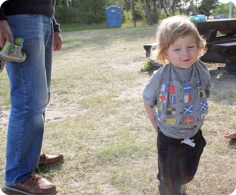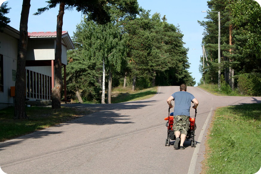 Istället stannade vi i båten och på land, fast ungarna fick lite tråkigt. På eftermiddagen gjorde vi ett nytt försök med sandstanden, som ligger 900 meter bort. Det är inte långt, men trötta tvillingben och bära-bära, gjorde att vi tvekade. Nu tog vi gåvagnen och då gick det bra.