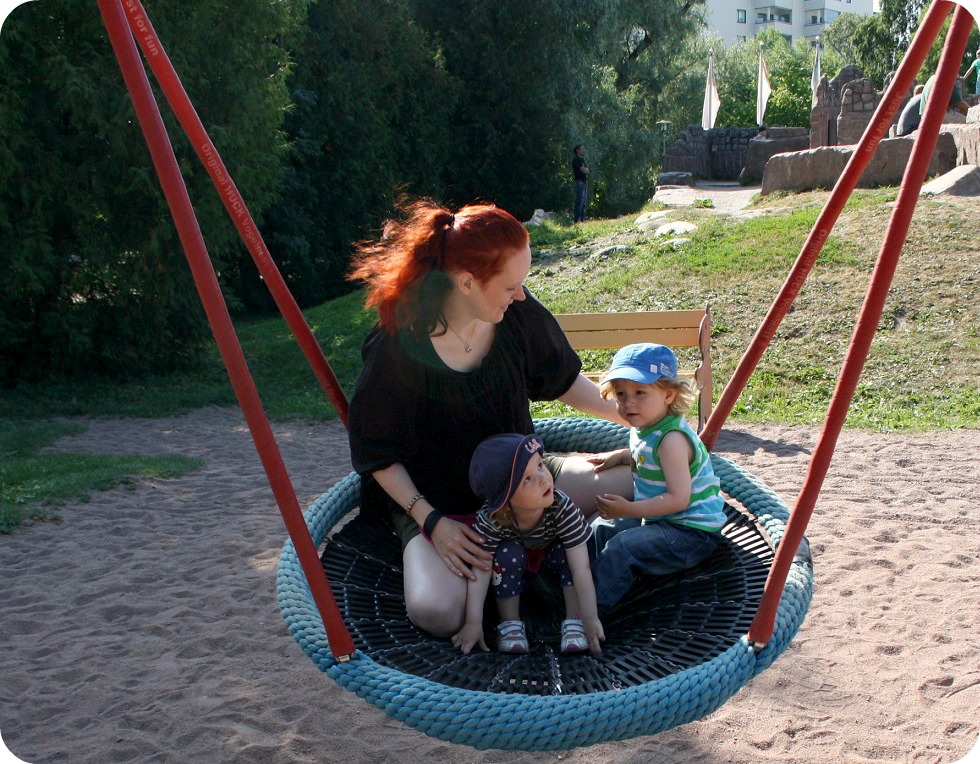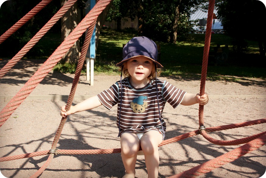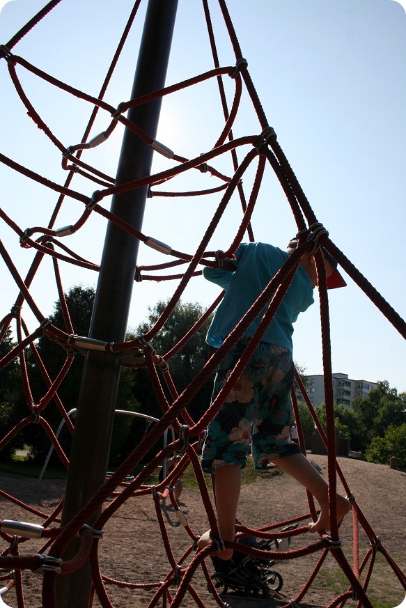 Vi lyckas också välja de varmaste dagarna att gå ut, eller känns det bara så för att man springer efter ungarna. Den största nackdelen med att bo i stan eller nära en stad är att allt är så begränsat. Nej, inte ut mot parkeringen! Akta lekplatsen, det kommer cyklar här utanför (vid ett speciellt ställe) och så vidare och så vidare. Alltid hämta med sig leksaker och vagnar ut, bära och kånka när ungarna inte själva orkar dem och min rygg blir aldrig bra för att jag bär barn, matkassar, böcker eller sopor varje gång jag går ut.