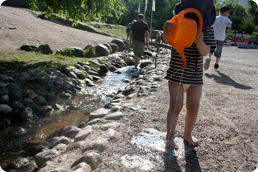 Idag var vi en stund vid Kuppisparken igen. Jag försöker förstå varför William alltid börjar med att bråka med nåt mindre barn (inte twinsen för en gångs skull) när vi kommer dit, men har inget svar. Han tyckte det var för varmt i solen, men vi hittade en fin, plaskig plats i skuggan lite senare och det blev många roliga båtlekar, trots allt. Jag hann slänga mig in via bibban och hämta tillbaka böcker som lånetiden gått ut på, rafsa åt mig 21 nya samt förnya den där ena boken vi inte hittade, på mindre än tio minuter, eftersom de andra väntade i bilen, hungriga.