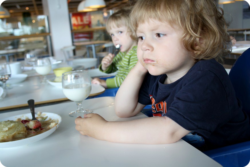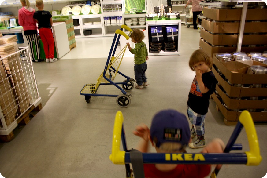 Dagens hitta-på-med-ungarna var att äta på Ikea. Det finns massor av saker Mika och jag hade velat kolla på, men vi kom snabbt fram till att det var störtomöjligt med tre barn. Jo, man kan härda ut och springa efter dem, lyfta dem tillbaks i vagnen och bära dem, men vi valde att äta och sen gå ner genom nedervåningen. Milja blev tokbesviken på hela ställen – hon hade ju väntat sig en rutschbana och lekpark! Jag hann i alla fall få med mig en badhandduk, två diskborstar, ett lock (äntligen i rätt storklek!!!) till vår stekpanna och en taklampa för 6,99.