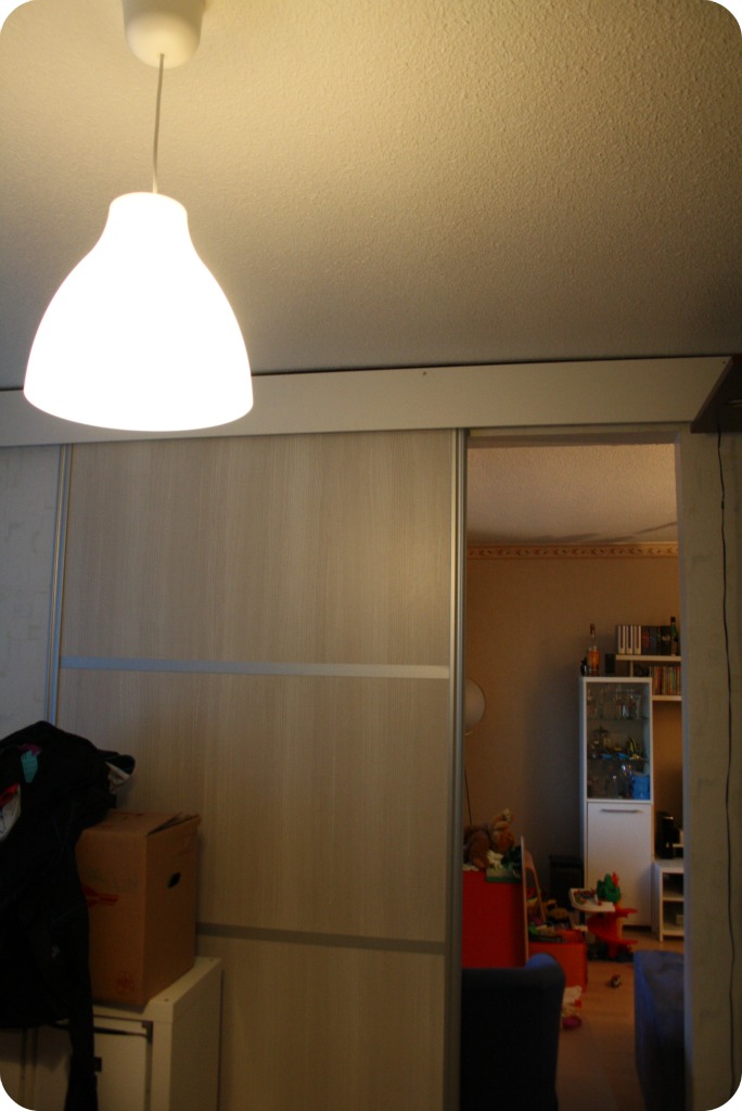 Och kolla! Där hänger den! Vår dyrbara lampa. Faktum är att energilampan inuti var en euro dyrare än själva lampan. Det tycker jag är lite lustigt. Men! Den tänds direkt! Wohoo! En annan ny grej är gliddörren i bakgrunden. Det har länge saknats en dörr i den breda öppningen, men nu är den nya dörren på plats och den funkar superbra! Och den var inte lika billig.