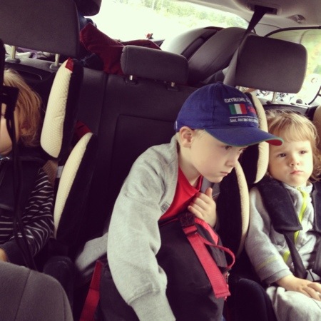 Först satt William i baksätet, men det funkade inte. Det blev lite gnäll om bilar, vems fot som rörde vid vem, inte-peta-på-mig, inte sparka syrran, Nej-inte-sparka-skärmen!
