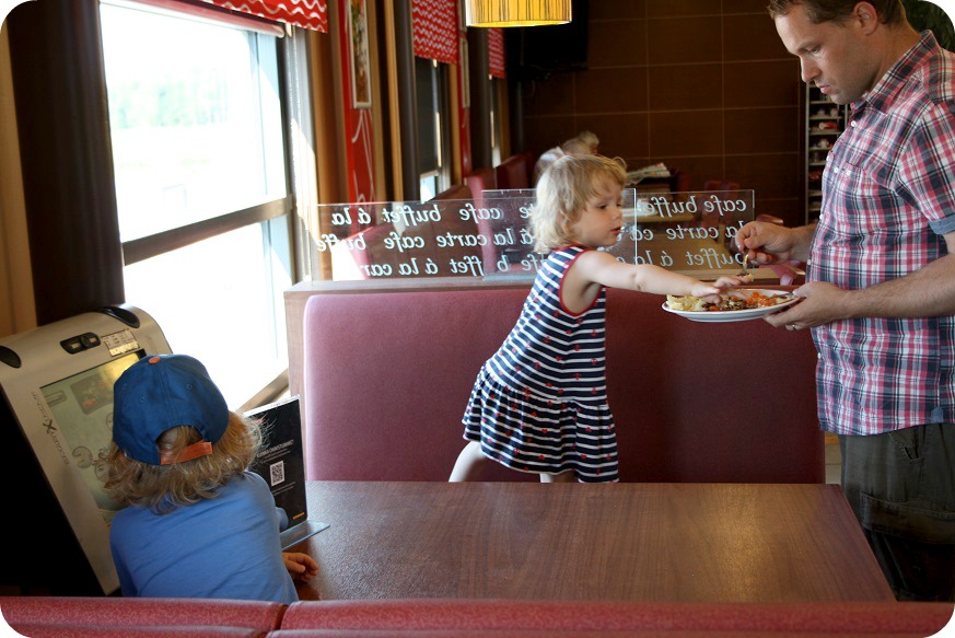 Paus vid Tomaten i Närpes. Ingen ville äta, utom vi vuxna som inte hann äta, mer än slänga i oss. Och jag fick inget ordentigt kaffe, hade ju till och med sparat dagens ranson till det här stället. Hmmmm… Såhär hade vi tänkt att de sen skulle sitta och äta.