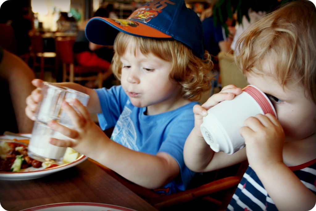 Men det blev såhär. William satt kvar på sin plats, men twinsen var överallt och speciellt Milja vägrade äta. När det utlovades glass åt hon några ynka skedar, stående eller hoppande vid bordet intill. Självfallet kom det en busslast med andra resenärer och ställde sig i kö, när vi skulle betala glassen. ”Man måste beTALA”, sa Isaac i min famn, men det är nog väldigt svårt det här med vänta. Efter glasshysterin klämde vi in oss på barnskötar-toan, alla fem, för att inte tappa bort nån. Ja-a, de har liksom vara en toalett just där, en pytteliten, men allt går om man måste! 😀