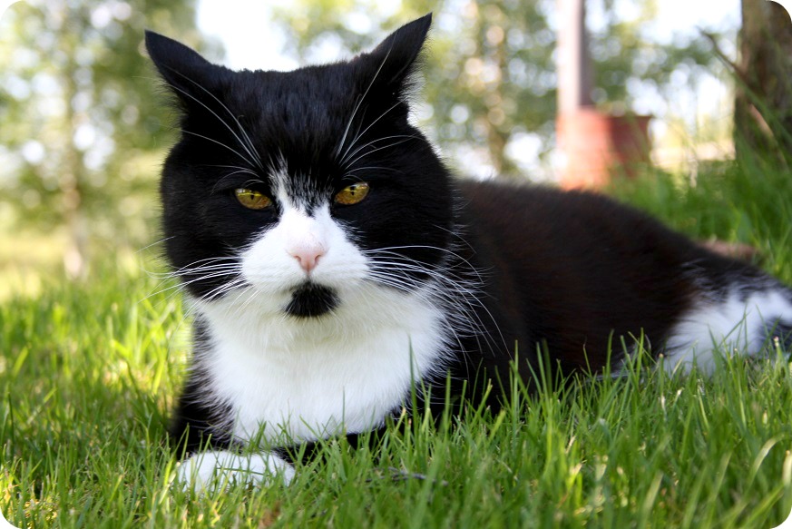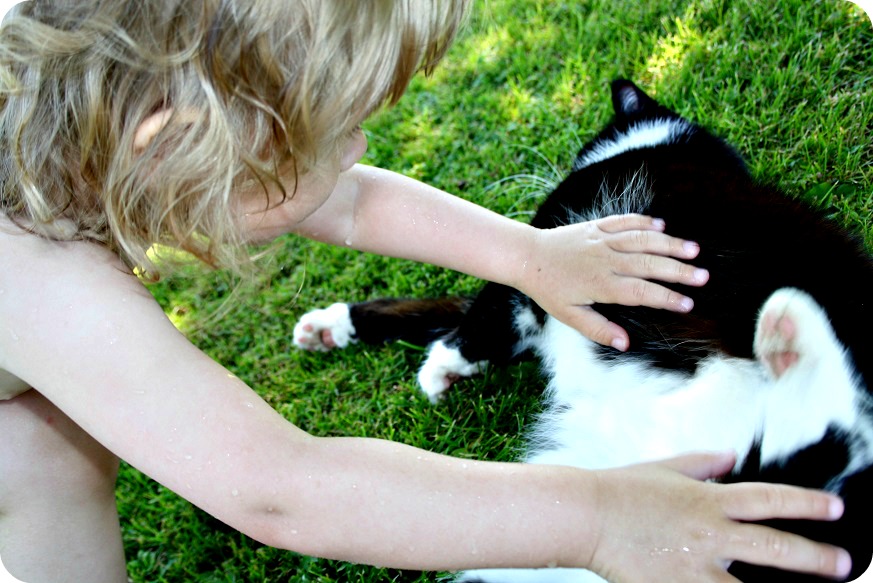 Det blev kattklapp och bad, men inte samtidigt. Kisse Bambam var inte alls intresserad av vattnet, utan höll sig på betryggande avstånd. Han har också gått undan en hel del. Det är en väldigt snäll katt, jag har inte sett honom bita eller riva, förutom om någon hållit hårt i svansen eller liknande. Det hände inte nu, utan Bambam tassade ljudlöst iväg för att han antagligen kände på sig att det är för stökigt eller ljudligt runt honom. Sen dök han upp med en mus.