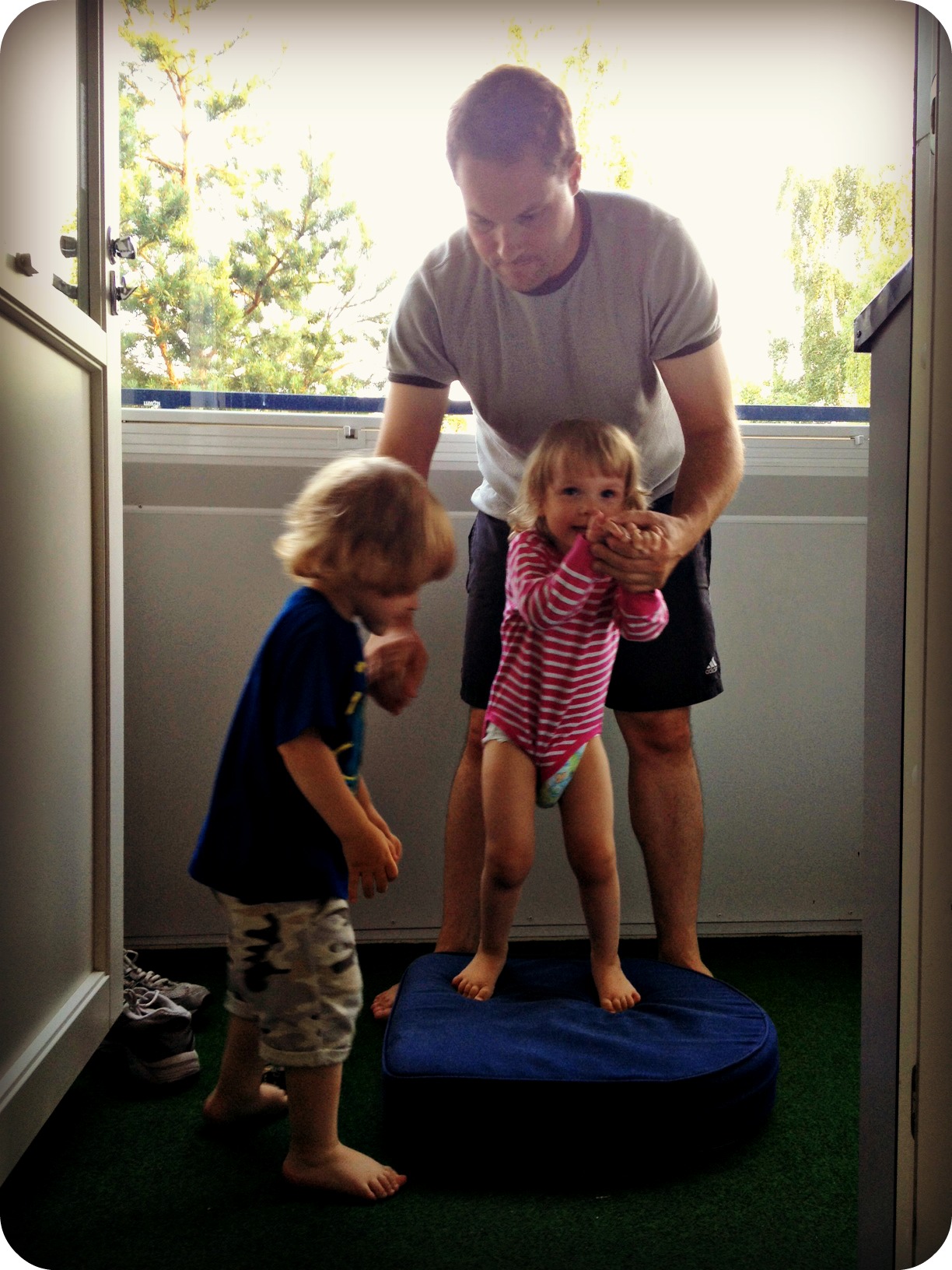 Och där stod de, stampande och dansande, Isaac snurrade runt på stället och sen hoppade de lite på en stolkudde. Som om ingen morgondag fanns, bara nuet och dansen. Mina fina, glada barn. Såna där småstunder är magiska.