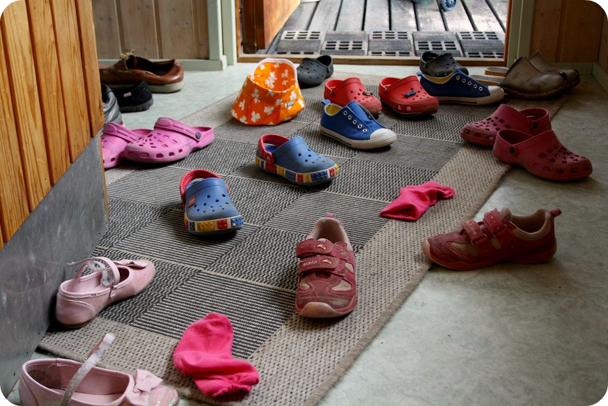 Den här bilden beskriver egentligen kalaset bäst. Barn, skor, liv, villervalla. Nu är vi trötta och glada, säger TACK för idag och på återseende! Klockan är tio och twinsen sover ännu inte. De har ätit godis, godis och godis idag, men det får gå. Det är ju fest. Nu måste jag gå, någon ropar ”mamma, mamma” i sovrummet.