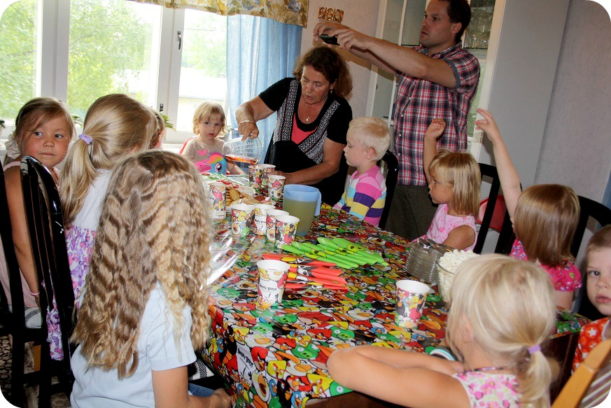 Jag hann inte fota så hemskt mycket själv under kalaset (vem vill ha saft? Vilken saft, okej du har inget glas. Du behöver inte äta all tårta, det här är laktosfritt, vi har glass sen, jo, du får mera godis, oj, når du inte popcornen?!). Vi hade elva sexåringar och sen tvillingarna att hålla reda på – och den här ljudnivån var obetalbar. Samtidigt fick jag också lära mig en massa saker. Sexåriga tjejer leker inte alls som killar! Och Milja blir ju större för vart år som går – det här är en nyttig erfarenhet. Fammo hade gjort hoppborg i en av skrubbarna på vinden och där släckte tjejerna lampan och lekte, berättade, tjoade och busade. Sen är det ju faktiskt så att barn leker annorlunda när de är med föräldrarna jämfört med hur de är sinsemellan. Ett tag satt en skock av dem alldeles stilla och såg på Rorri Racerbil tillsammans med Isaac och faffa. Det var lite magiskt.
