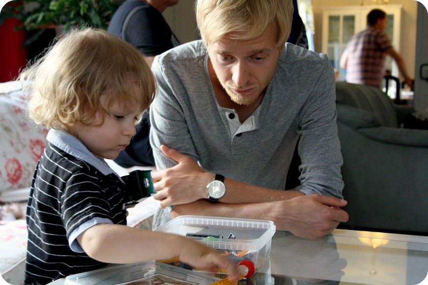 Lite senare kom musteri Pirjo och Janne (som stannade under hela barnkalaset), Ritva, Roope, Riku och Sofie och vi var många vuxna på plats! Även iso-mummi Eine och Timo var där och det var coolt! Det kändes så bra! Det var aldrig någon som var ensam, det finns alltid någon famn att komma till eller någon som engagerar sig i en lek. Riku och Isaac var djupt fokuserade på ett klossbygge, efter kalasets slut.