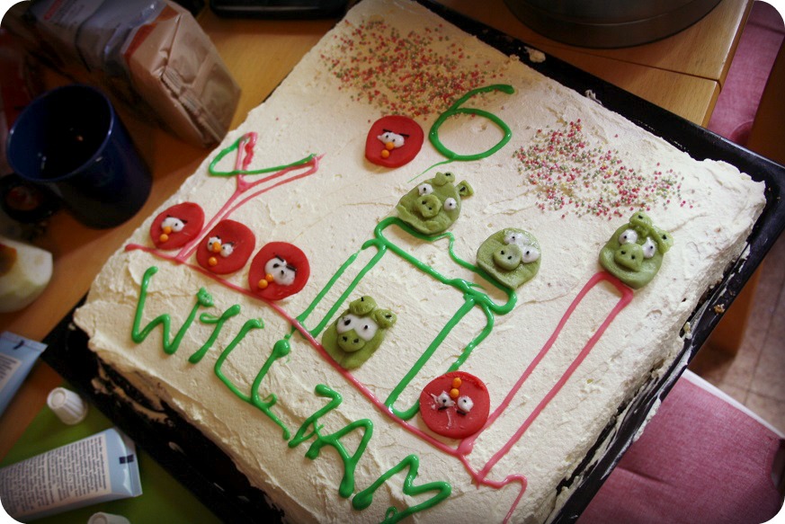 Jag bakade en stor kakbotten, fyllde den och ritade (med en extremt dålig och trög sockermassa!) konturer på tårtan. Mika gjorde de fina grisarna och fåglarna i marsipan! Alltså ja, säga vad man vill om alla snygga tårtor med sockermassa och superdetaljerade glasyrer – men gräddtårta går alltid hem och den här blev riktigt bra. Som mormor brukade laga! Till den gick det åt 6 dl socker och 6 ägg – men det räckte till nästan 20 personer.