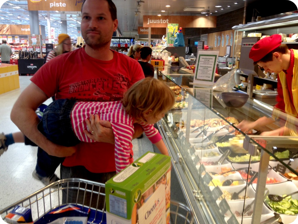 Inte längre. Hon har hållits bra i en sån där bilvagn, men inte nu längre. Nu leker hon att hon tvättar bilen, springer runt den, springer ifrån oss, sticker iväg vid kassan, skrattar som en dåre och vill gå långt, LÅNGT utan mamma och pappa. Hon, som brukar vara så blyg inför främmande människor. Varför funkar det inte när man ska handla? Igenom kom vi i alla fall, det är bara att ta barnet under armen och promenera vidare då och då.